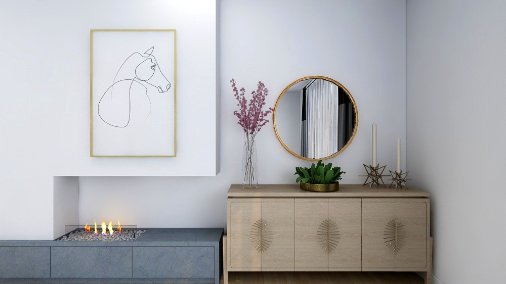 In this layout, as you enter the space you will see an entry console table with a couple of table lamps on the console that will help the space feel cozy. A perfect complement to tall walls is vertical artwork. We have placed artwork around the console to fill in the empty space and help draw the eyes upwards. As you enter in this area your eyes draw up to the ceiling and so to make a statement  a large fixture is chosen to connect the upper and lower portions of a room.