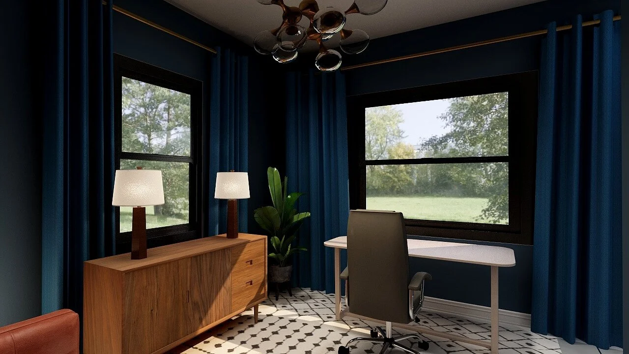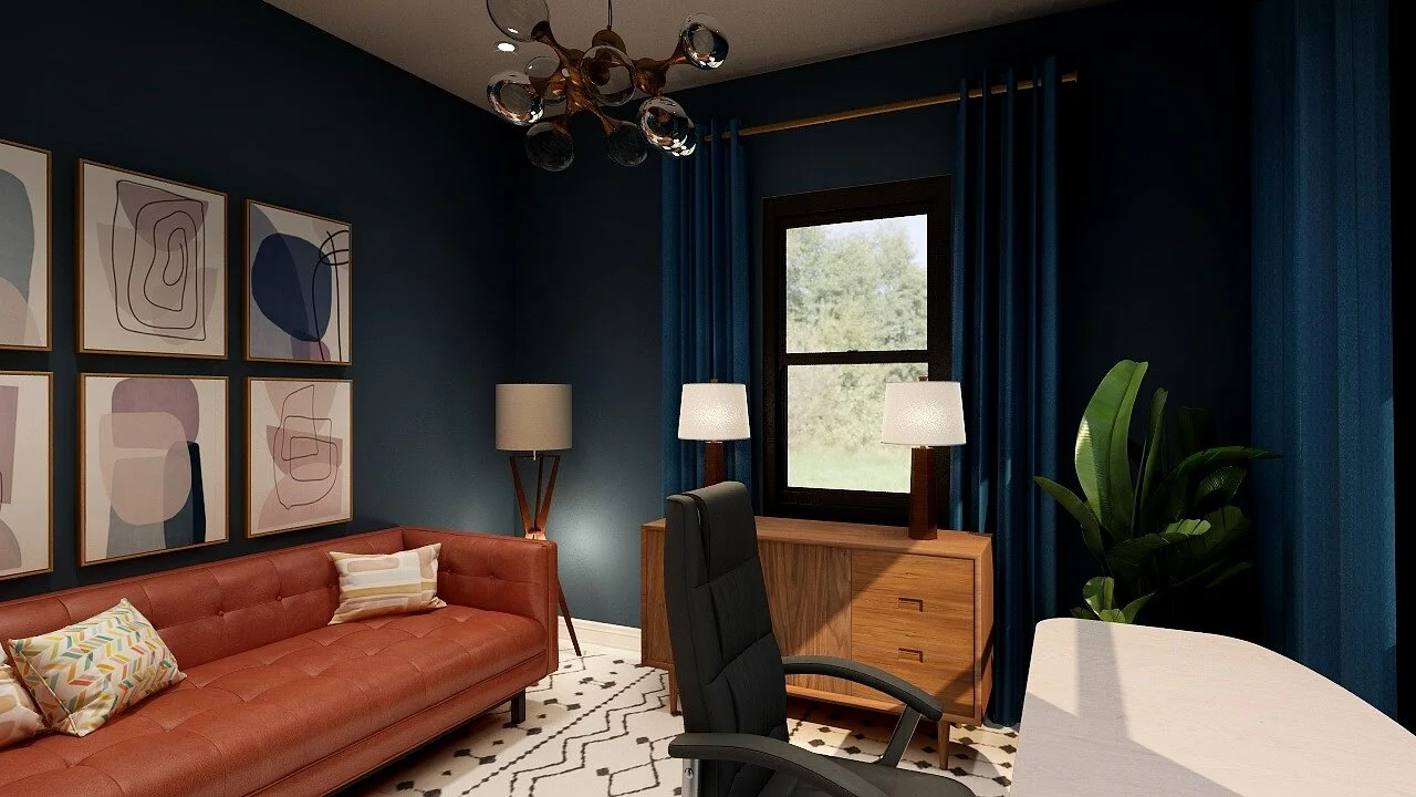 This floor plan has an office desk in front of the big window. As you mentioned you need a sofa, I have it placed in front of the back wall for John to relax and/or read when he needs a break. This sofa will also be great for hanging out with the little ones when they come to visit in between. Also a set of artwork above the sofa on the wall will look beautiful. A free standing lamp will also be helpful for reading and will provide ambient lighting for the space. I have added a credenza which will be great for storage and a planter for some freshness and greenery. A rug will also be perfect to anchor the space and add some softness.