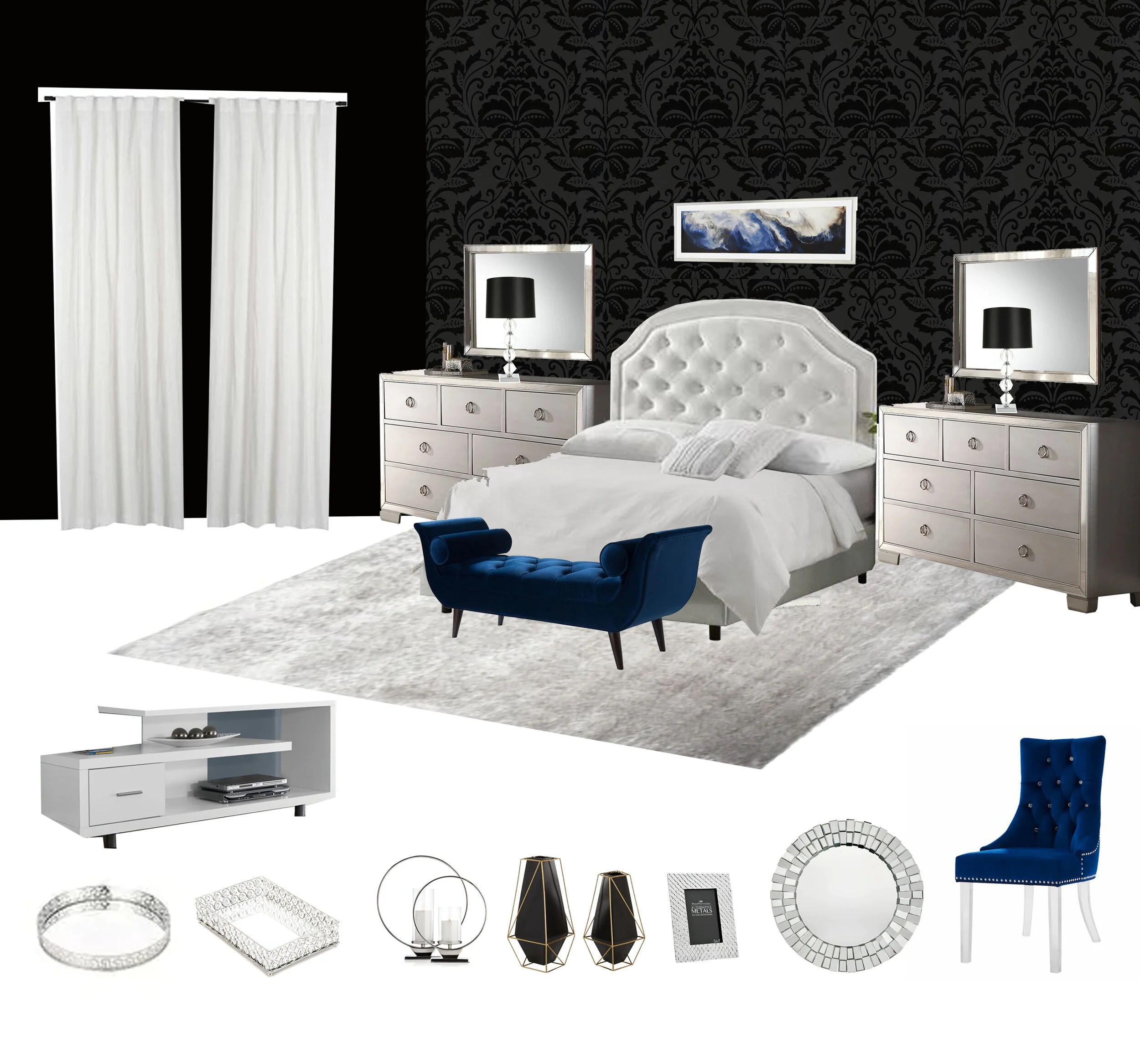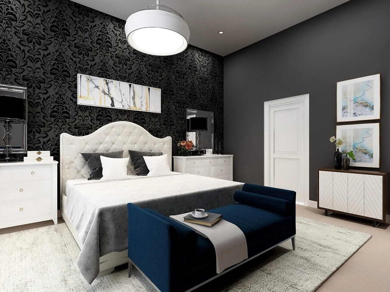Regarding the placement of furniture, we can have a console table for the TV and a bench in front of the bed. Also, we can place art above the TV to draw eyes up as the ceiling is high. To complete the look of a glam room, you'll need a handful of decorative pieces. I will show the options after you review and provide feedback on which look you would like to go with.