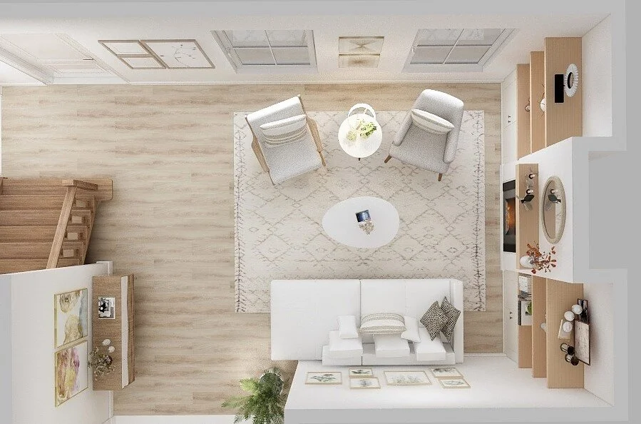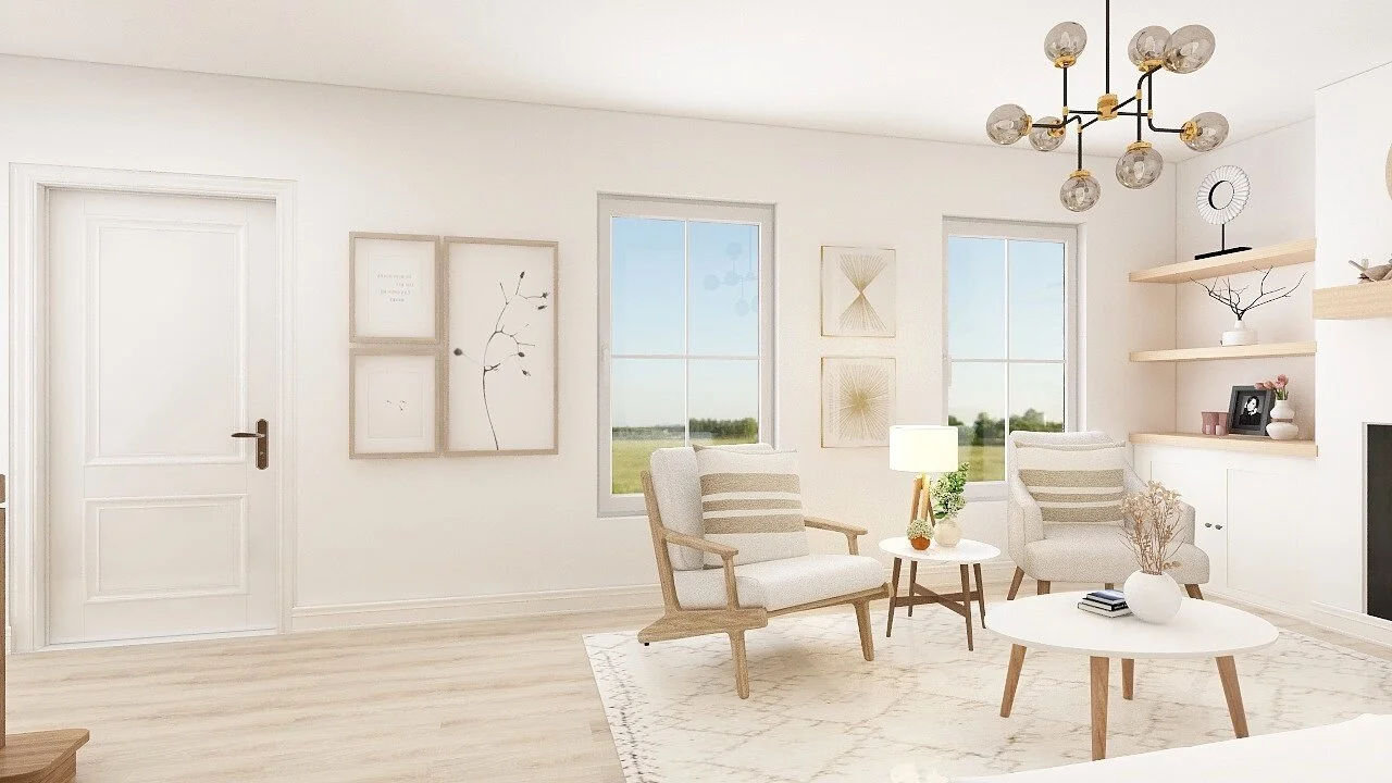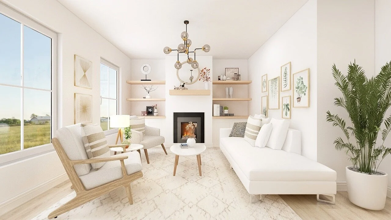 This living is going to have an existing white sofa and an existing chair, with another chair which will be an accent chair. Also a coffee table with side table and accessories. The colour palette will be a neutral base with lots of whites and creams. A rug to anchor the space and make the space feel cozy and inviting. A console table can be placed where original as an option. We will hang the existing wall art between the two windows with another art work, having artwork above one another will draw your eyes up.
